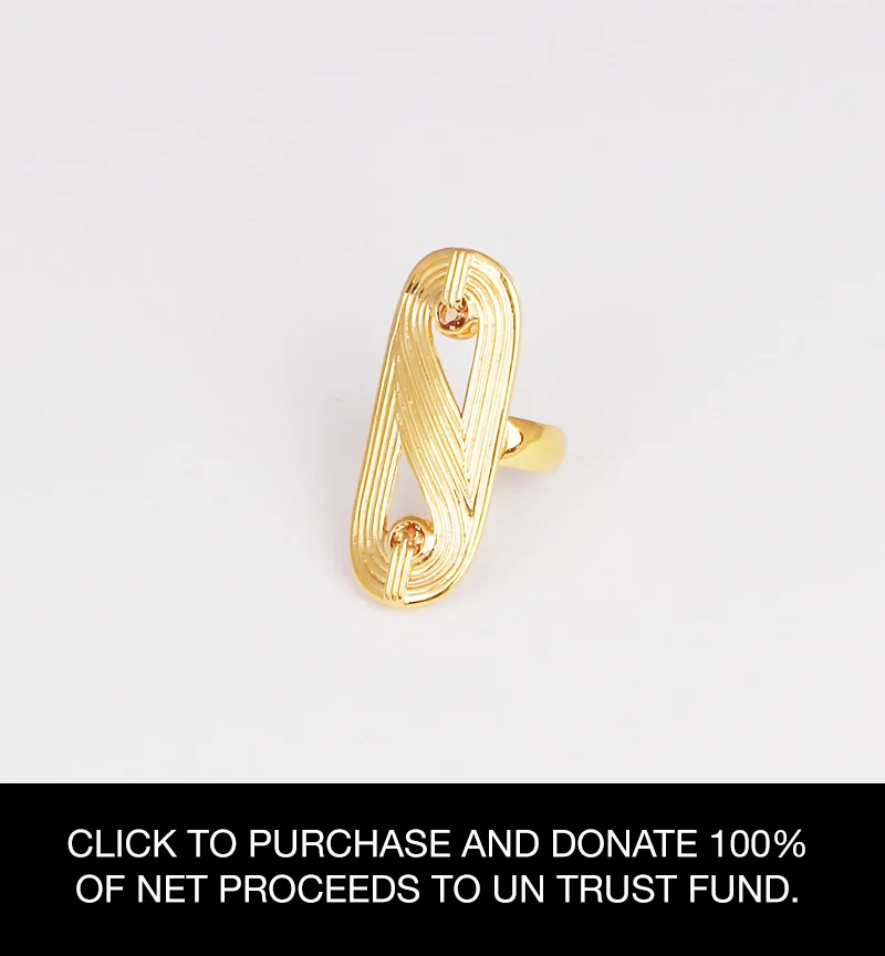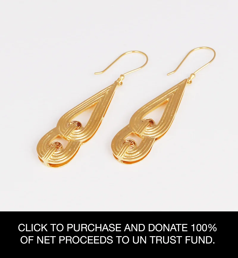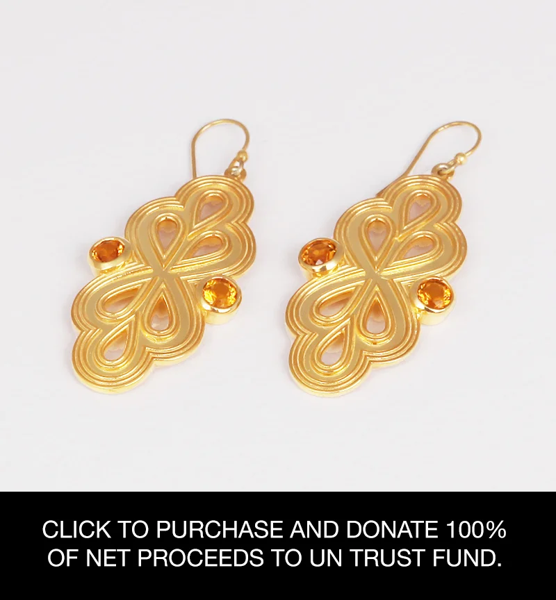 Yuwei designed the limited edition collection by remaining true to her signature aesthetic, yet still picking up on the distinctive teardrop shape of the logomark for the UN Trust Fund, which represents the tears of survival of the women they support. Key pieces of this handcrafted collection include gold-plated earrings, bracelets, necklaces and rings that tell a story of strength, power, dignity and healing drawing from Yuwei’s own life experiences. The designs incorporate orange citrine stones that are used as one of the colors of the Fund’s brand and which symbolizes a bright future, without violence against women and girls.